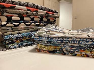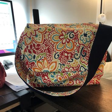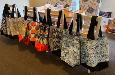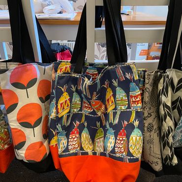 Reversible deep totes with canvas outside and patterned inside. Fully washable, lined, reinforced handles ready to handle whatever you need to take with you!